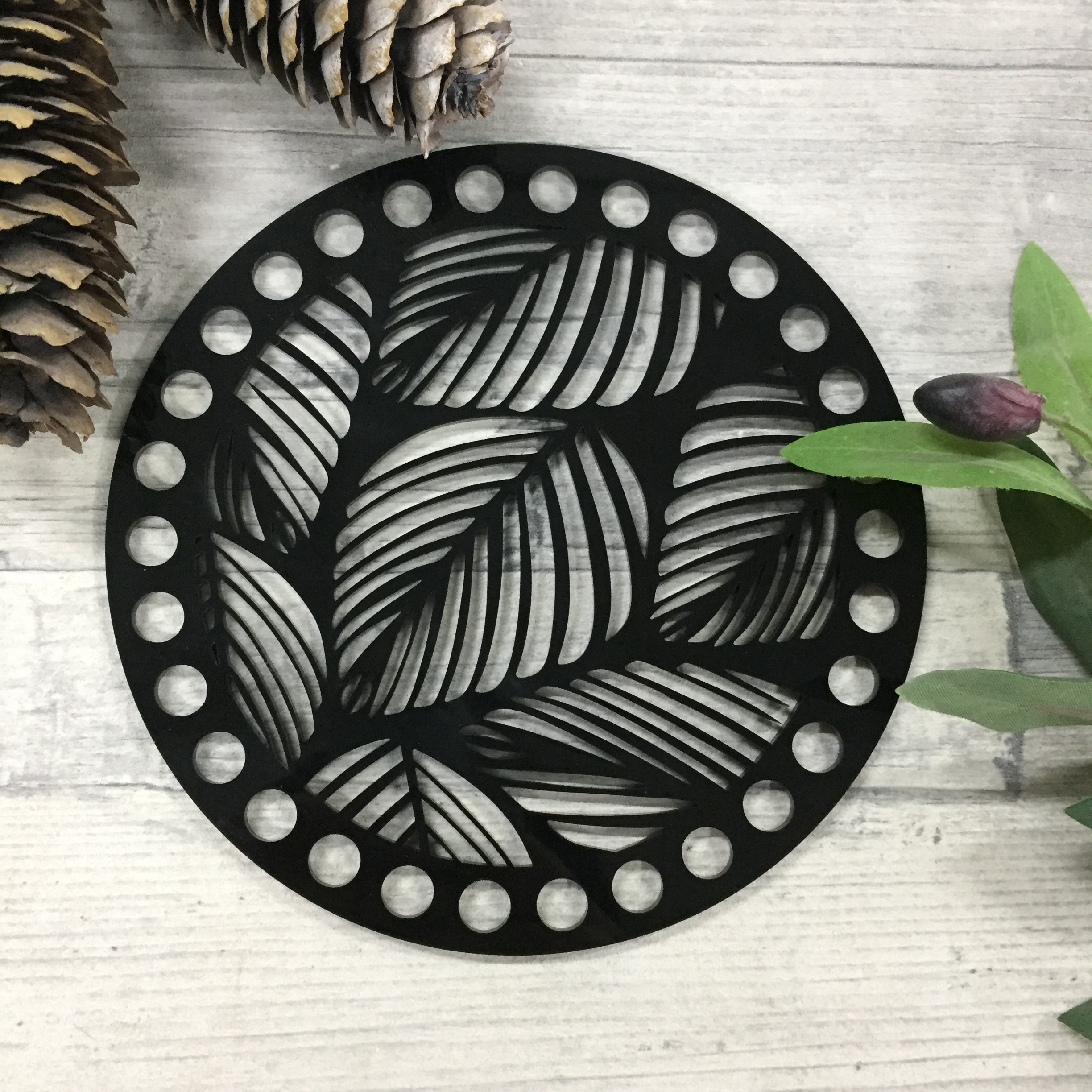 2022 Черная резная боковнка для сумок, крышка для корзинки, оргстекло "Листья" D=15см