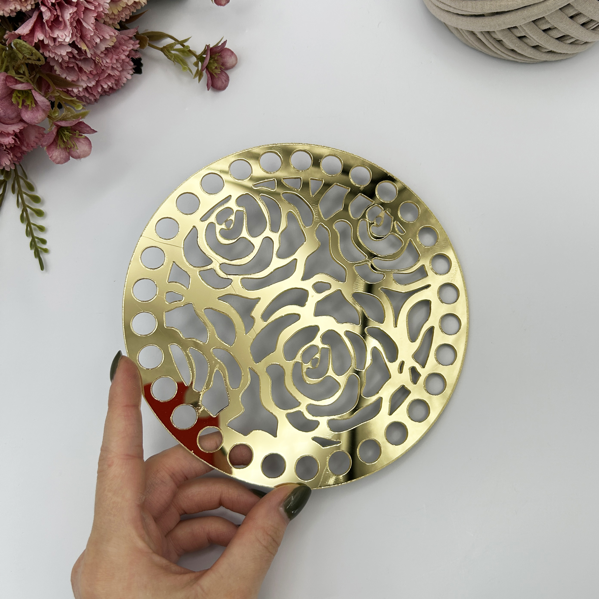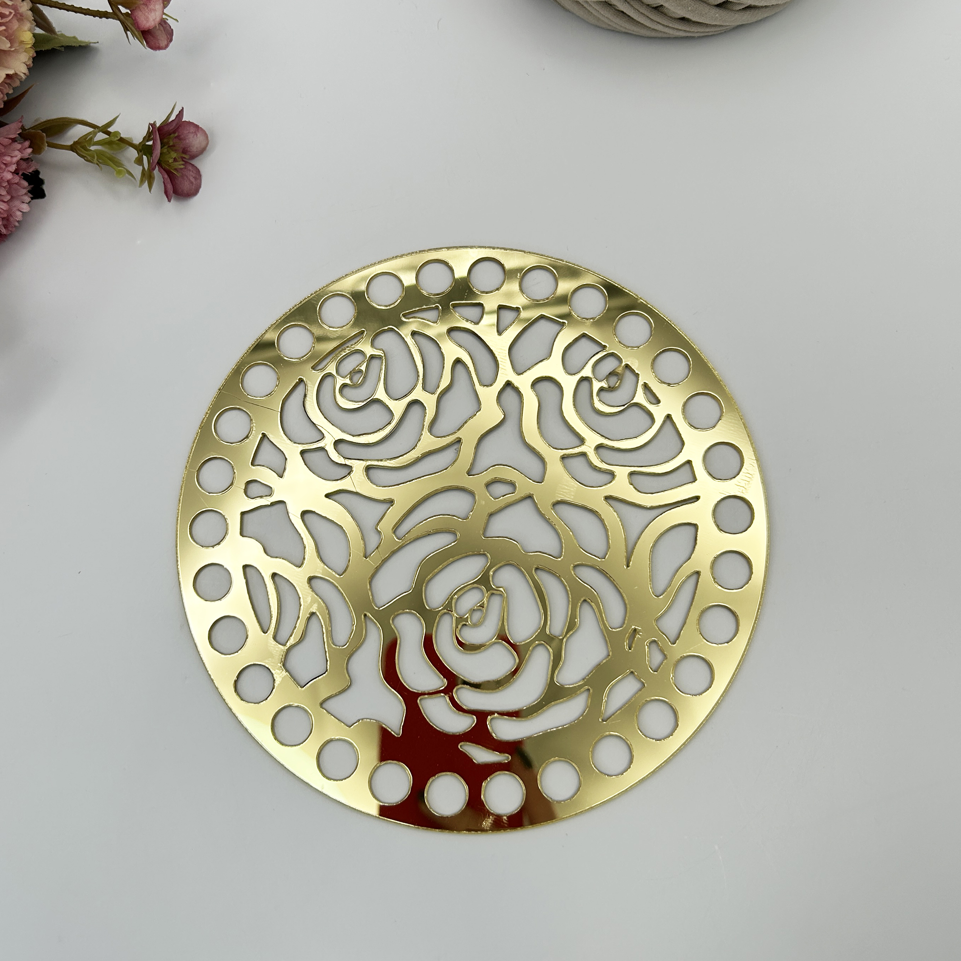 2023-3 Резная боковинка для сумки, крышка для корзинки, оргстекло "Розы", d=15см, цвет золото