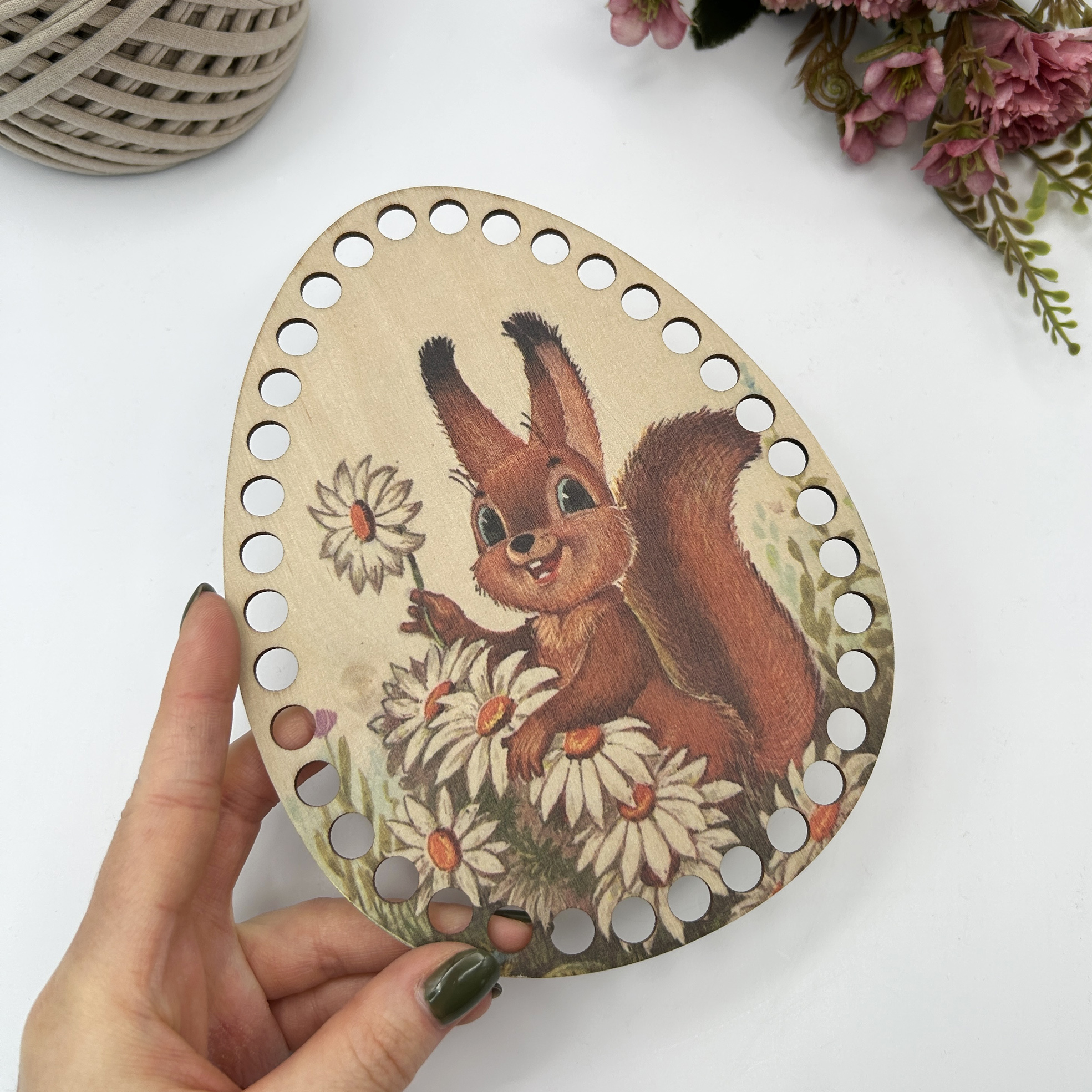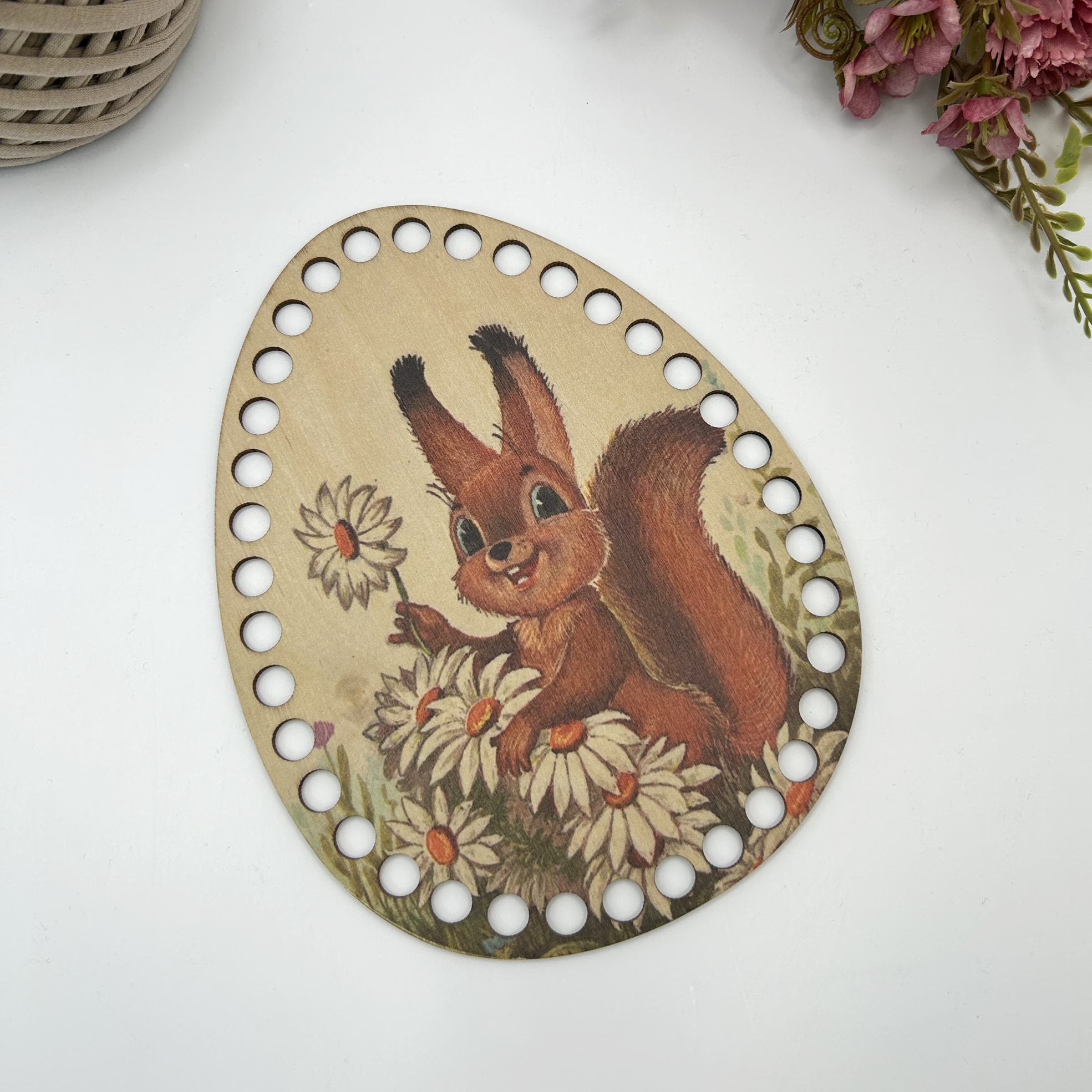 1426 Деревянная крышка с рисунком "Белочка с ромашкой", d=17х13 см