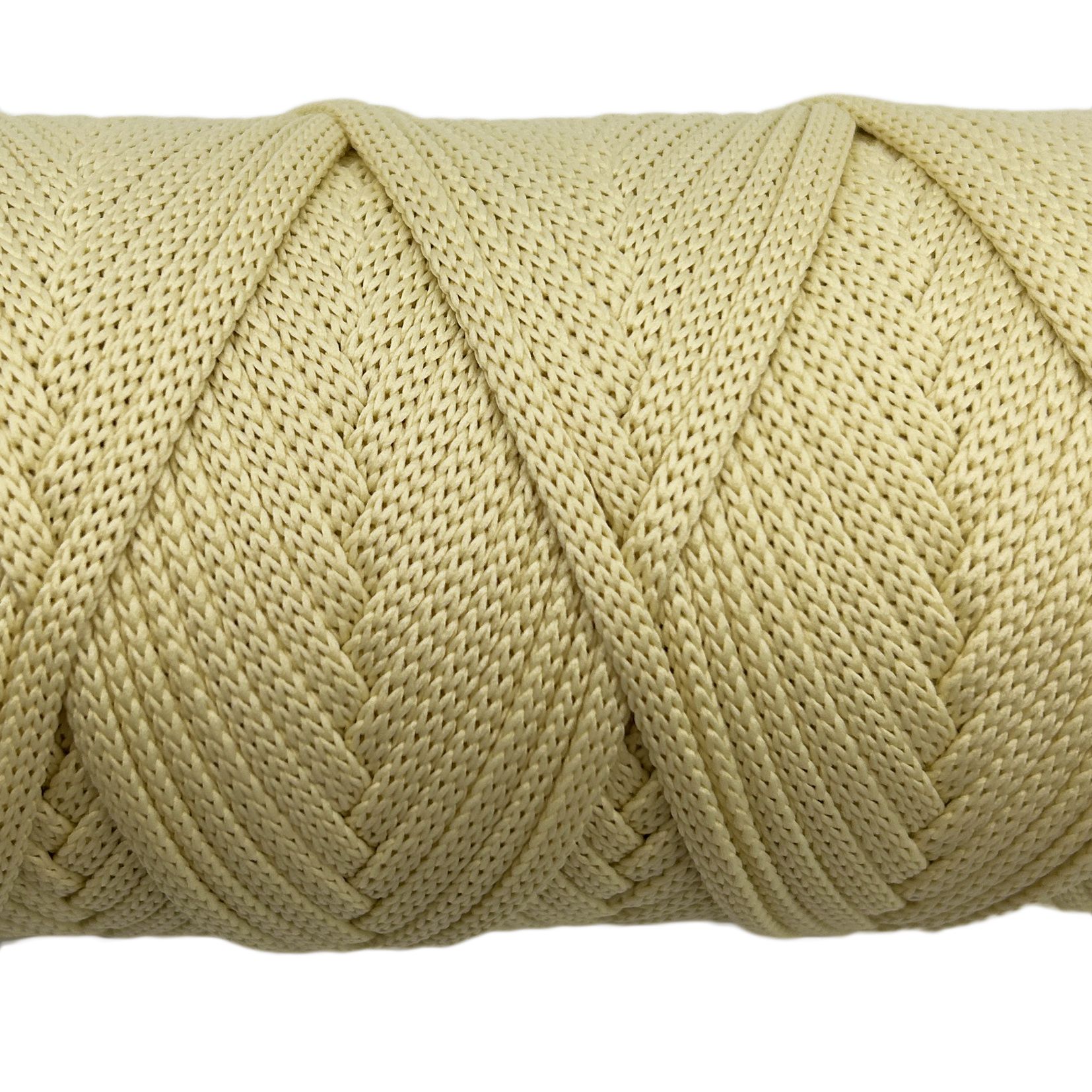 Облегченная версия полиэфирного шнура без сердечника диаметром 4 мм цвет Сгущенка отличается повышенной мягкостью и эластичностью за счет более тонкого плетения нитей.Шнур плоскийТакой тип шнура более подвижный, мягкий, слегка растягивается. Отлично подходит для вязания салфеток,сумок,ковров и корзин.