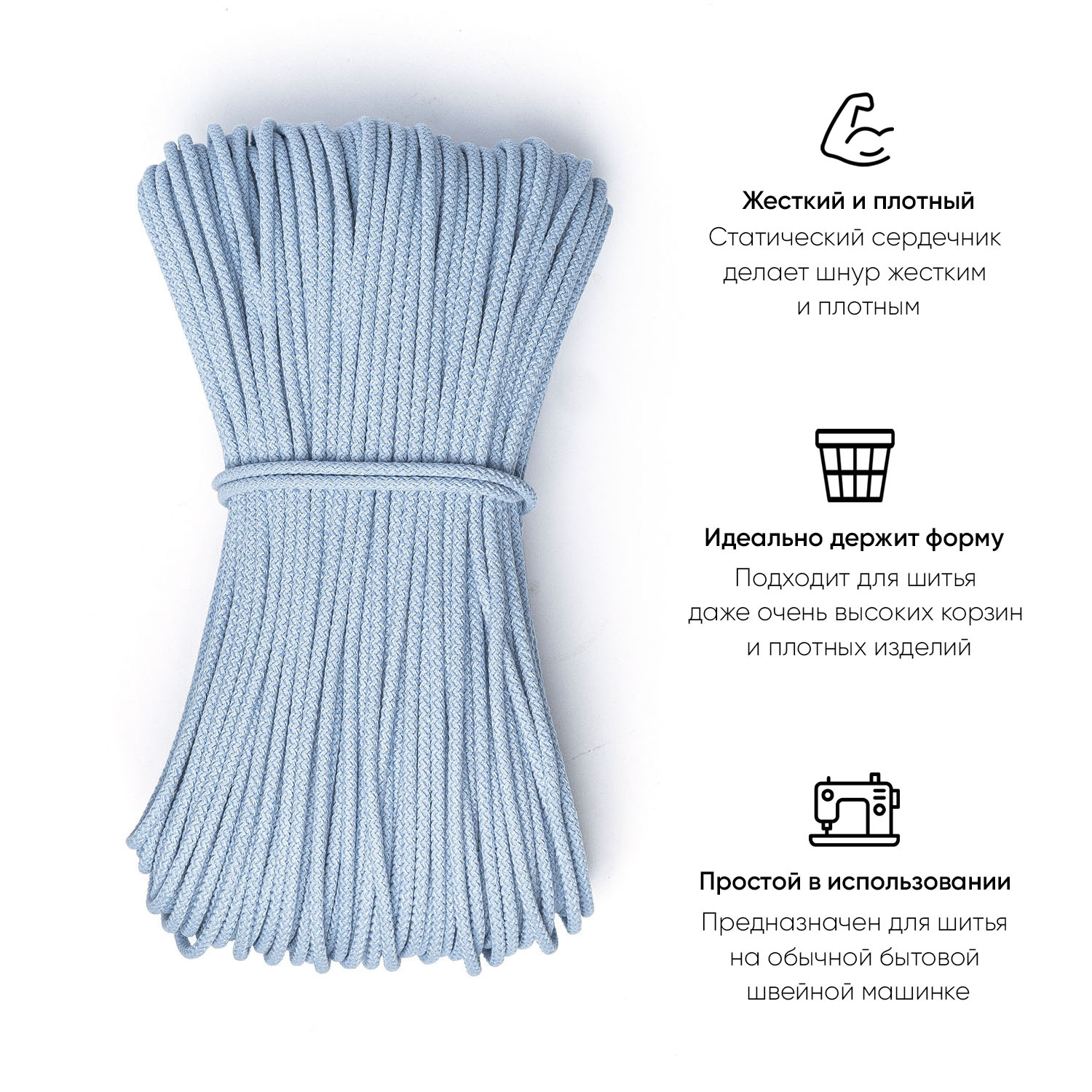 Прекрасный шнур нежнейшего голубого цвета. Качество отменное - плотный, жесткий, однородный, сердечник не выглядывает. Шить легко, изделия отлично держат форму, их очень приятно держать в руках.