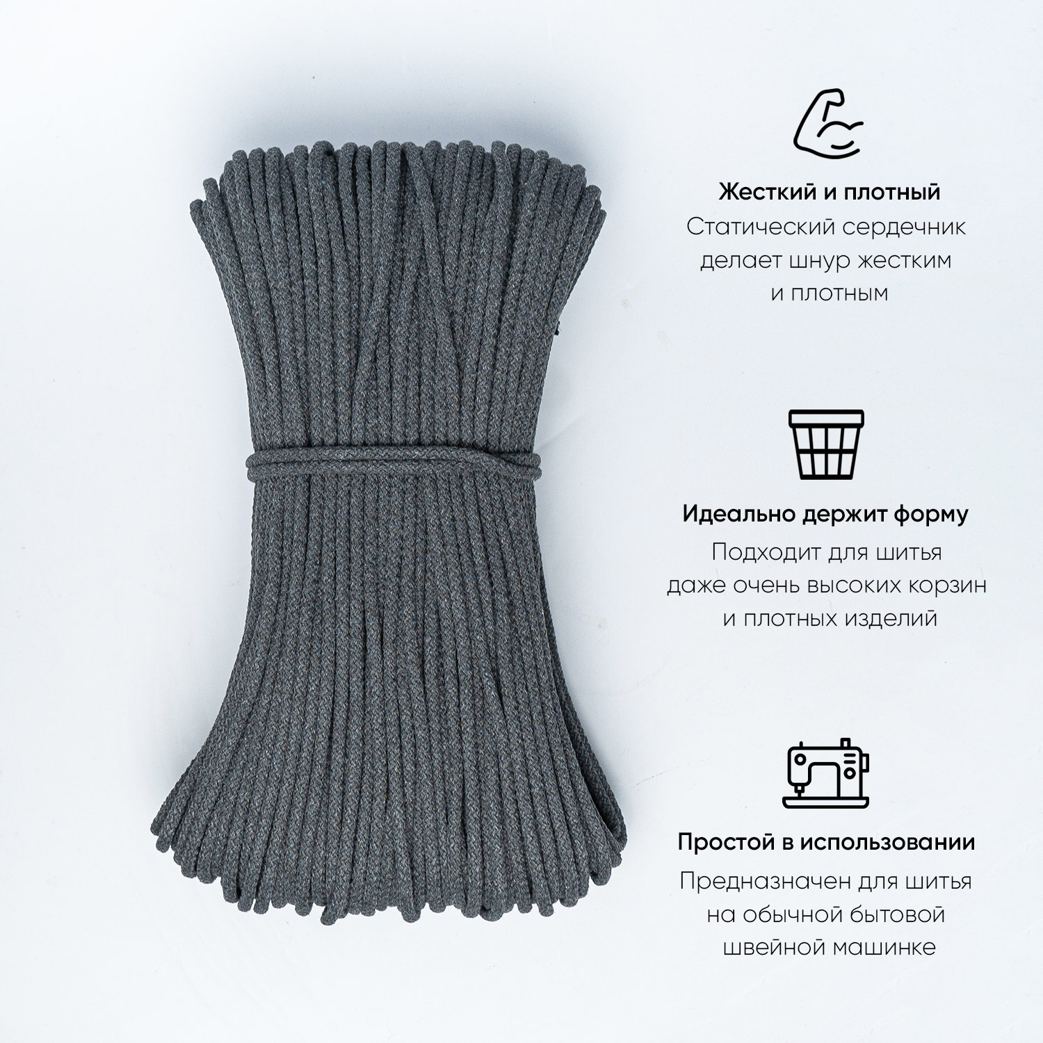 Хлопковый шнур для шитья с сердечником 5 мм/30 м, цвет Тёмно-серый