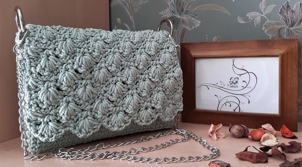 Вверху на боковинке сумки закрепляем по 1 кольцу-карабину с обеих сторон. Пристегиваем ручку-цепочку и пришиваем магнитную кнопку. Сумка готова.