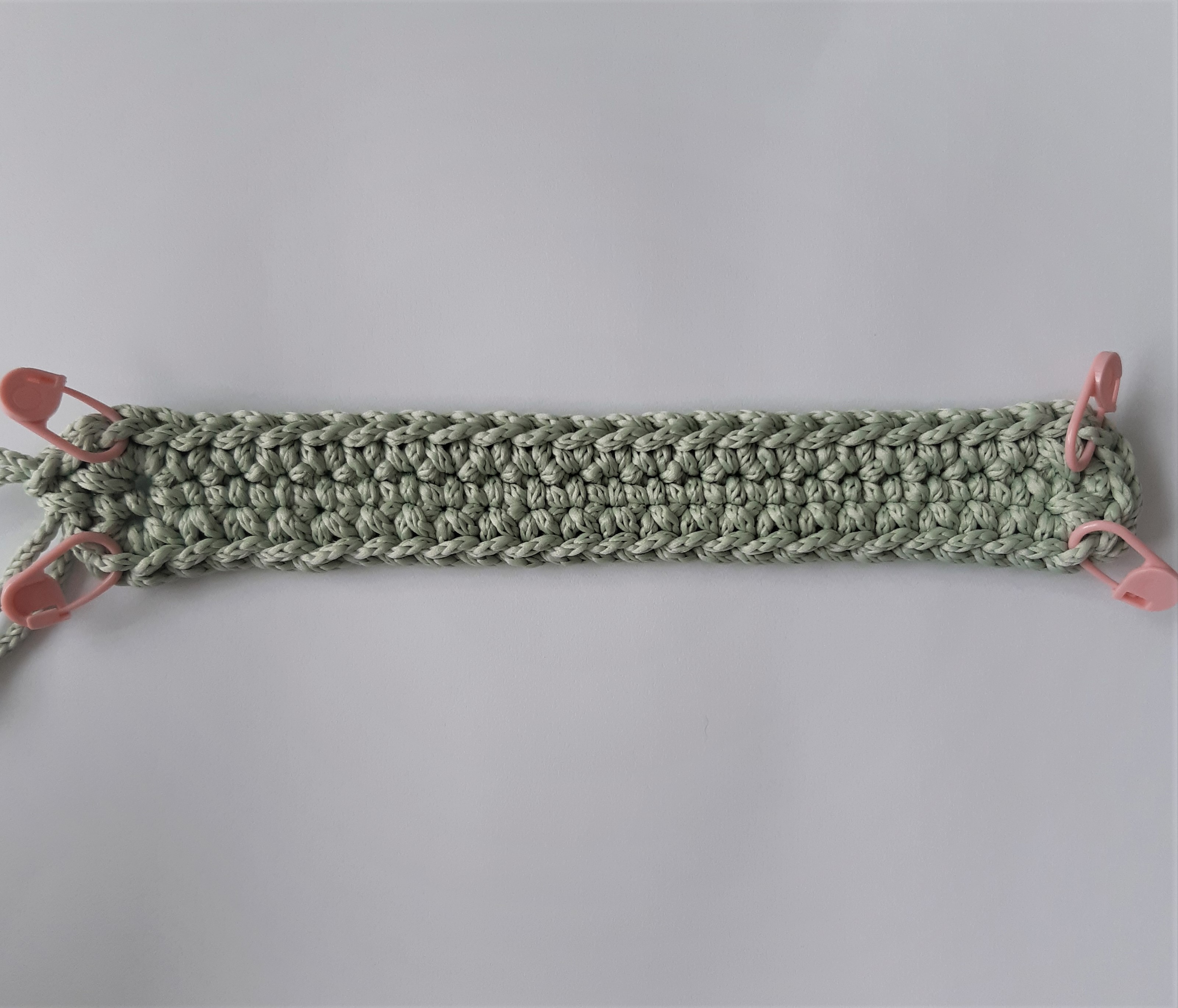 - Поворачивая вязание провязываем 23 СБН заводя крючок за перемычку. Делаем 1 ВП (центральная петля боковинки)