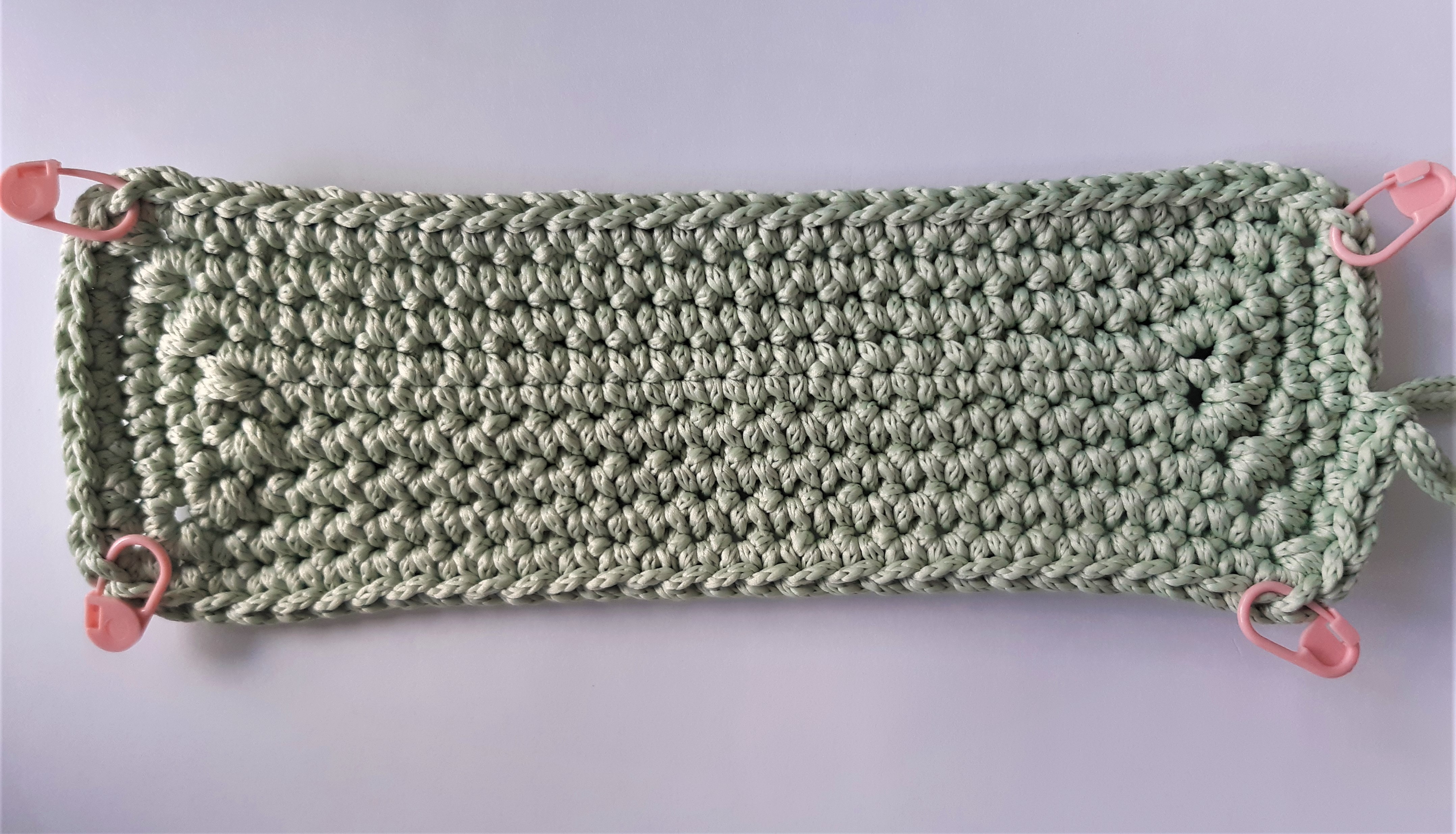 Отмечаем маркером середину на задней стенки сумки. Отсчитываем от нее вправо и влево по 16 петель. Всего 33 петли. Далее вяжем ажурным узором 17 рядов см схему ажурного узора.