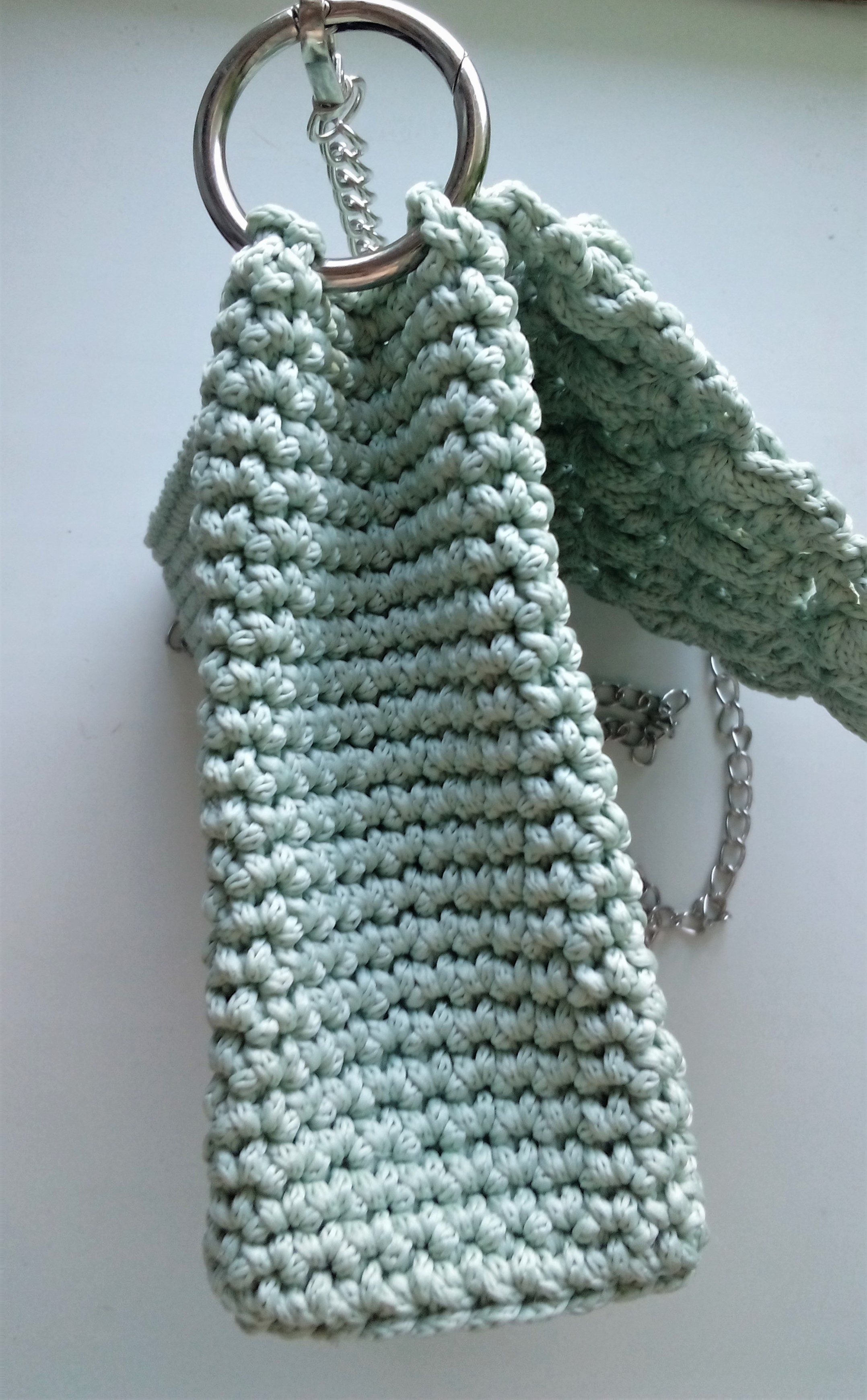 Материал: полиэфирный шнур 3мм цвет-мятный от интернет-магазина Hobyt, кольцо-карабин-серебро d=3,5см, цепь-серебро, пришивная магнитная кнопка-серебро.