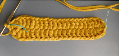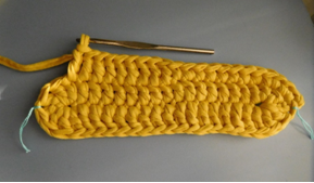 Затем складываем наше вязание, так, чтобы по форме напоминало заячье ухо и провязываем 7 столбиков без накида, соединяя при этом стенки обеих сторон. Ухо готово. Аналогично вяжем еще 3 штуки. Не забываем в конце вязания каждого ушка оставлять ниточку для пришивания.