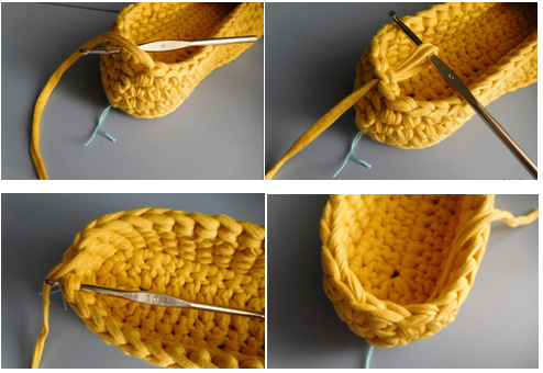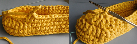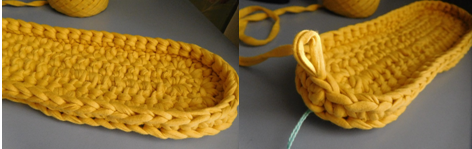 Теперь вяжем саму тапку. Для этого заводим крючок с внутренней стороны и протягиваем петлю на другую сторону подошвы(она будет внутренней).