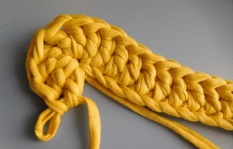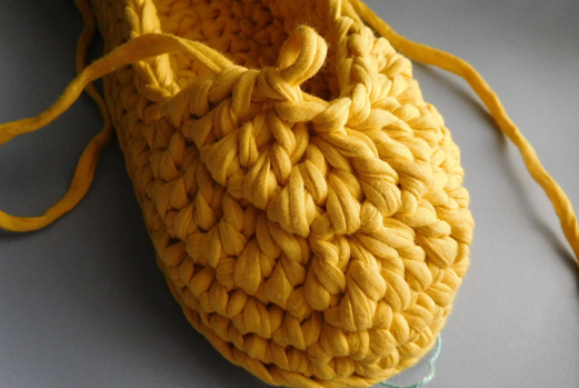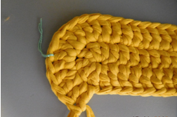 Мы вяжем тапочки 38-39 размера. Если нужен размер меньше, тогда соответственно необходимо провязывать меньшее количество воздушных петель. Например, из данной пряжи для 36-37 размера необходима цепочка из 16 воздушных петель. Так как трикотажная нить бывает разной толщины, то и количество воздушных петель в начале вязания может отличатся в зависимости от размера Вашей ноги.