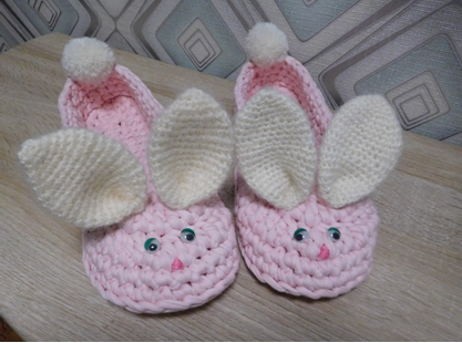 Далее пришиваем уши и помпоны к тапкам, приклеиваем глазки и вышиваем розовой нитью носик.