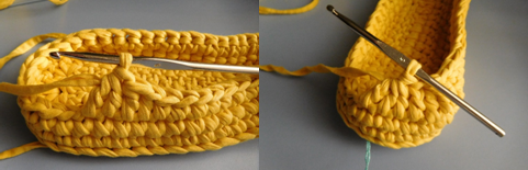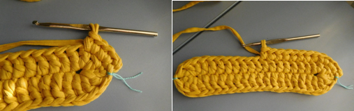 Теперь вяжем саму тапку. Для этого заводим крючок с внутренней стороны и протягиваем петлю на другую сторону подошвы(она будет внутренней).