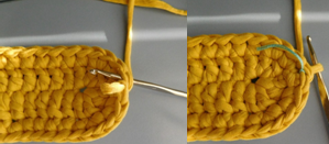 4-й ряд довязан, осталось сделать последнюю соединительную петлю. Для этого обрезаем нить длиной 10-12 см, вытягиваем ее. Заводим крючок за обе стенки первой петли 4-го ряда, захватываем кончик нити и протягиваем, далее крючок заводим в последнюю петлю и протягиваем нить. Оставшийся кончик нити заправляем внутри более тонким крючком.