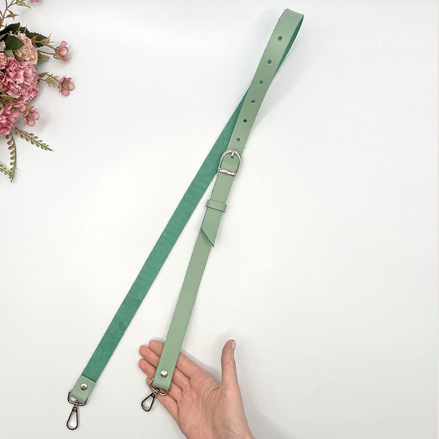 КРР_12 Кожаный регулируемый ремень для сумки с серебряными кнопками и карабинами, 92-118,5 см, Мята